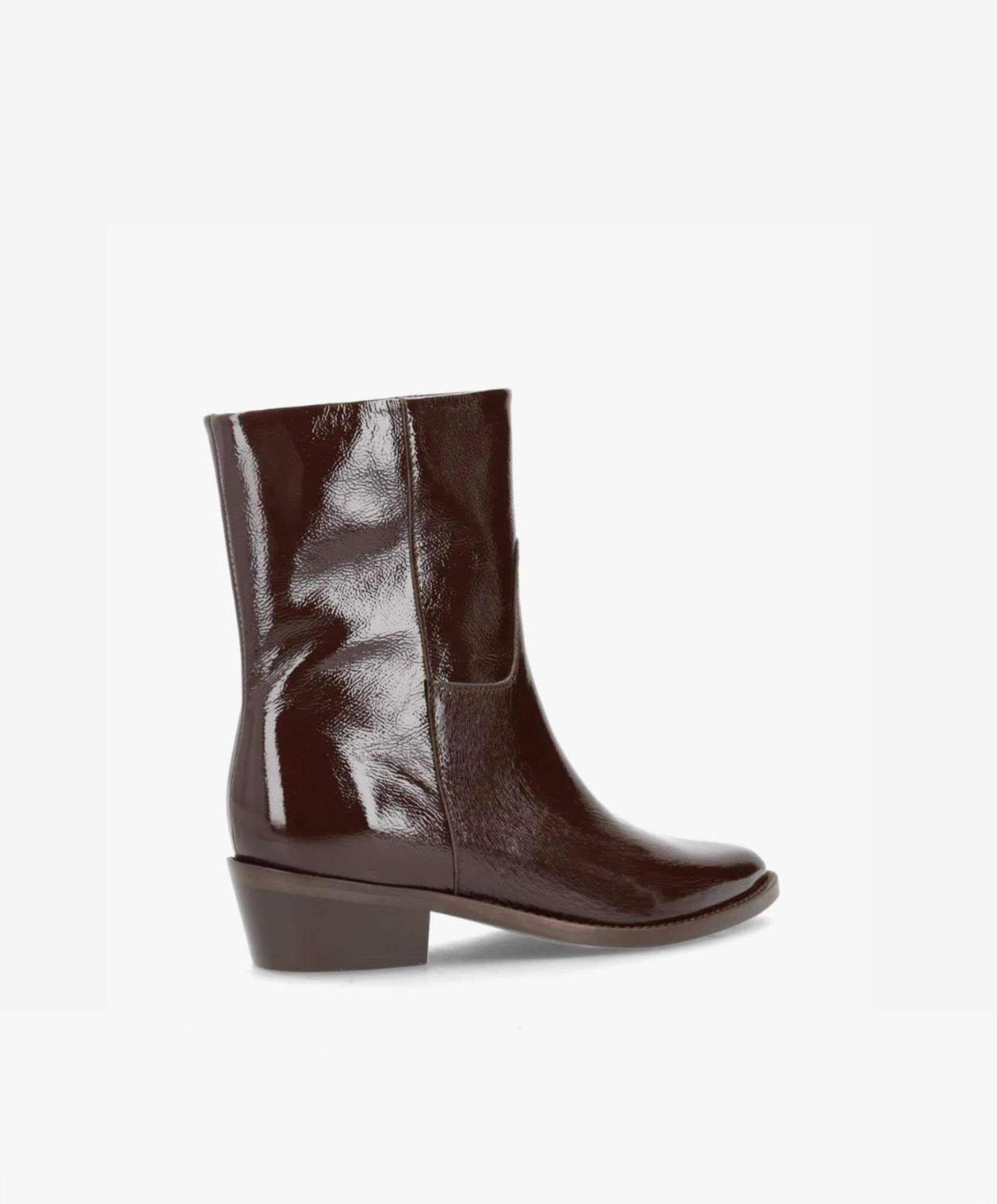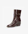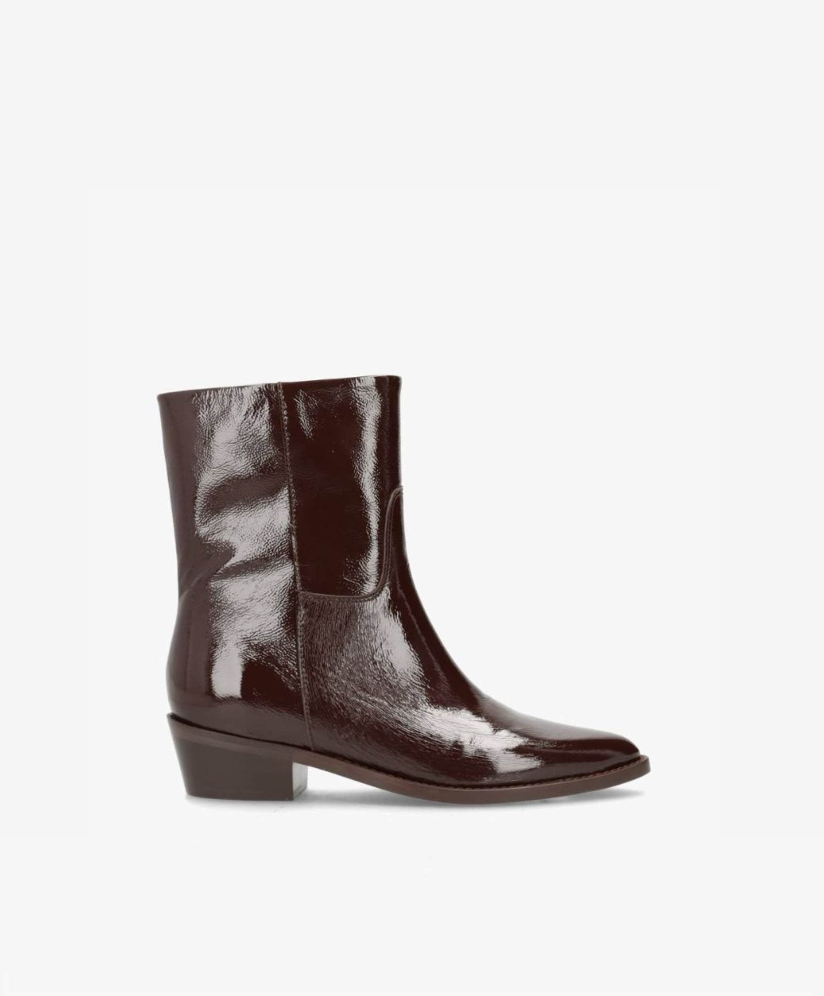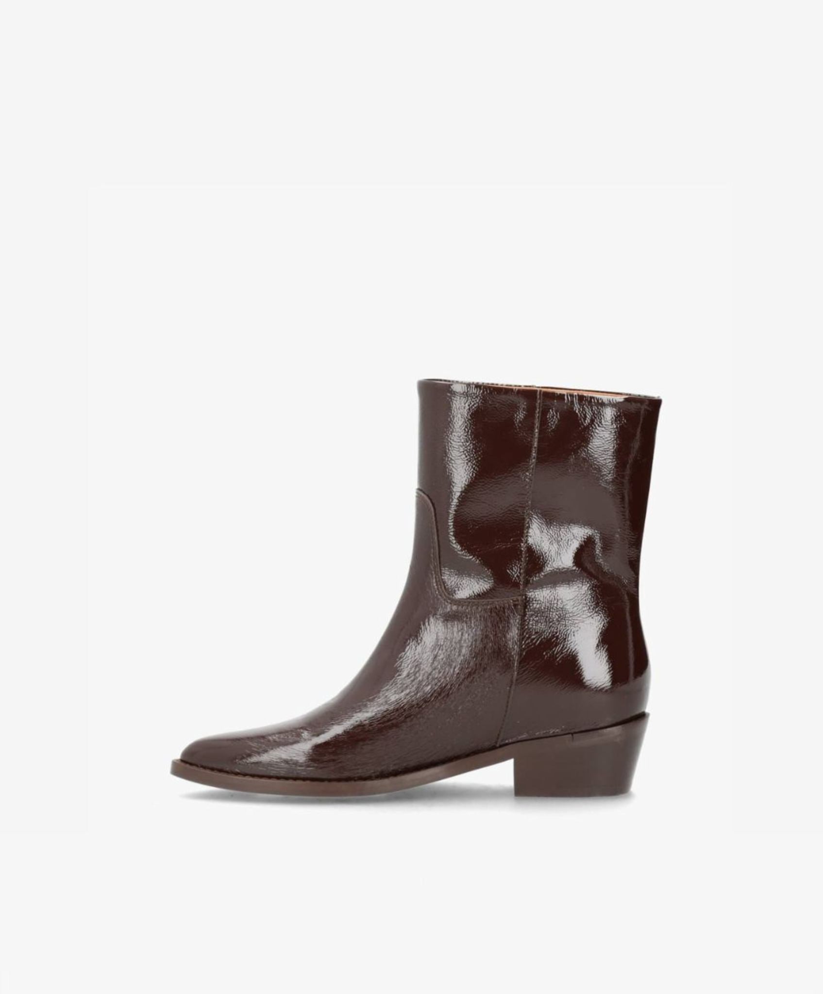 CONFIDENCE LOW P er en elegant ankelstøvle, der kombinerer et moderne look med klassiske linjer. Det blanke brune laklæder giver støvlen et eksklusivt og iøjnefaldende udtryk, som løfter ethvert outfit. Den korte længde gør modellen alsidig og perfekt til både bukser, kjoler og nederdele.